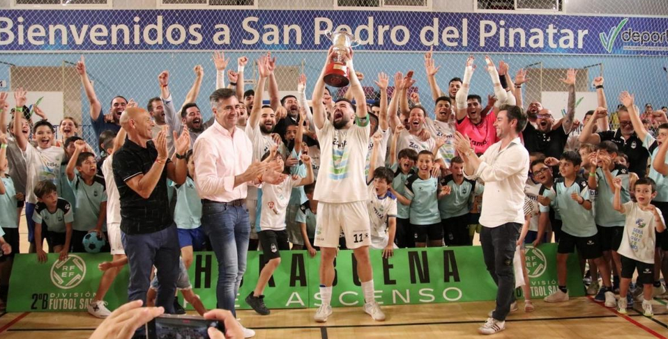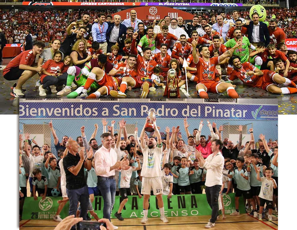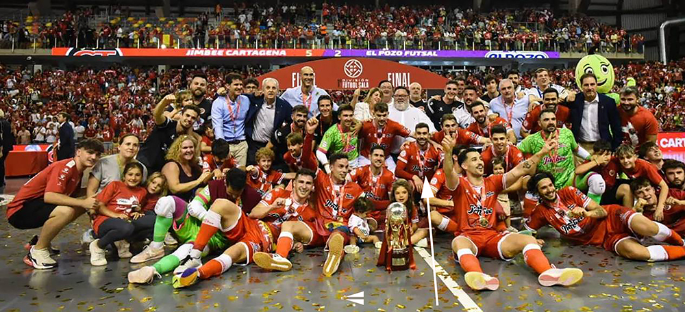 Alberto, a quien hemos señalado con una flecha en la foto superior, se ha proclamado campeón de la primera división de fútbol sala con Jimbee Cartagena, mientras que su hermano José ha ascendido a segunda división nacional con Zambú CFS Pinatar como capitán del equipo y mejor goleador.