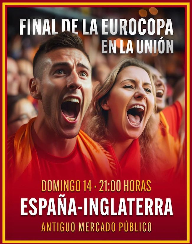 El Ayuntamiento de La Unión comunica que el partido en el que España disputará el título de campeón de la Copa de Europa de selecciones de fútbol frente Inglaterra este domingo a partir de las 21 horas podrá vivirse en comunidad en el histórico edificio modernista de la plaza de Joaquín Costa.
