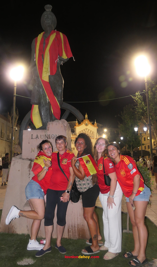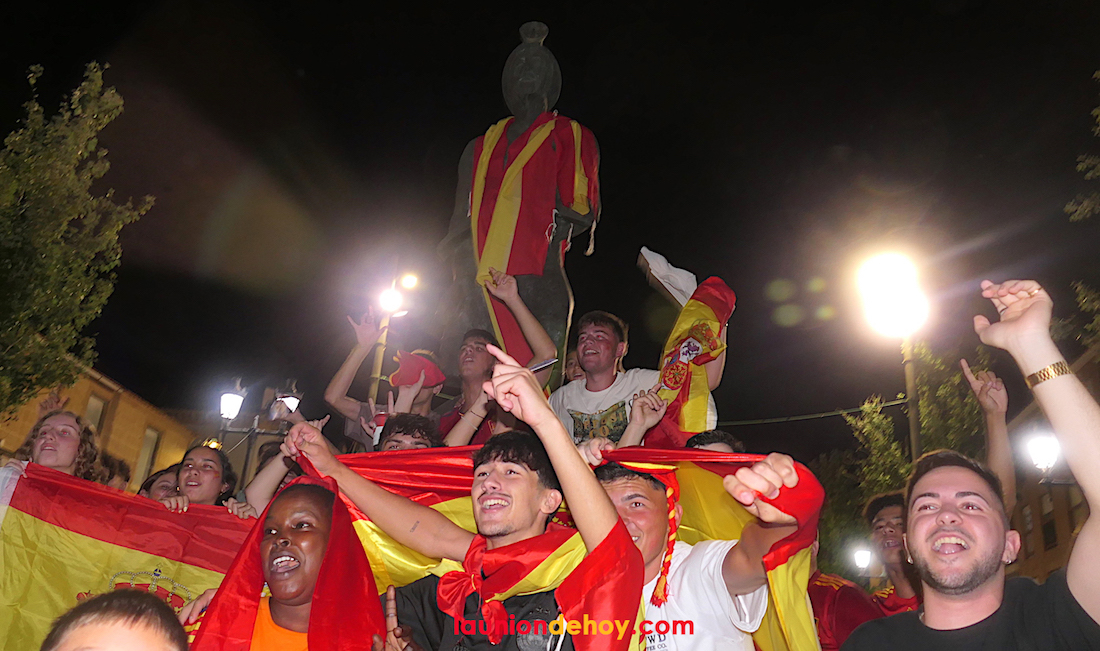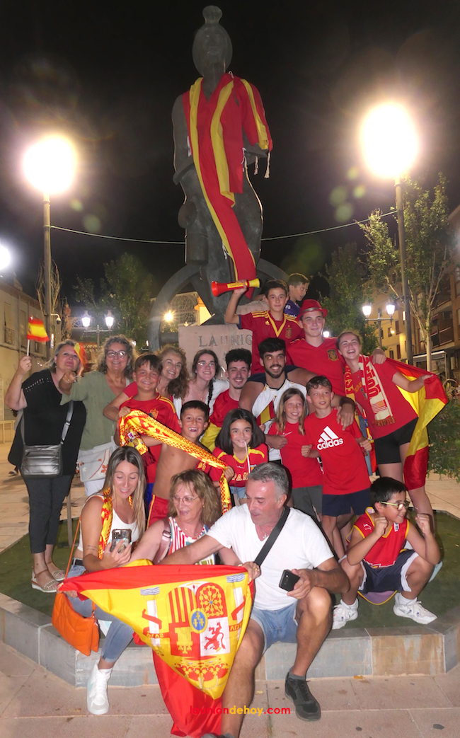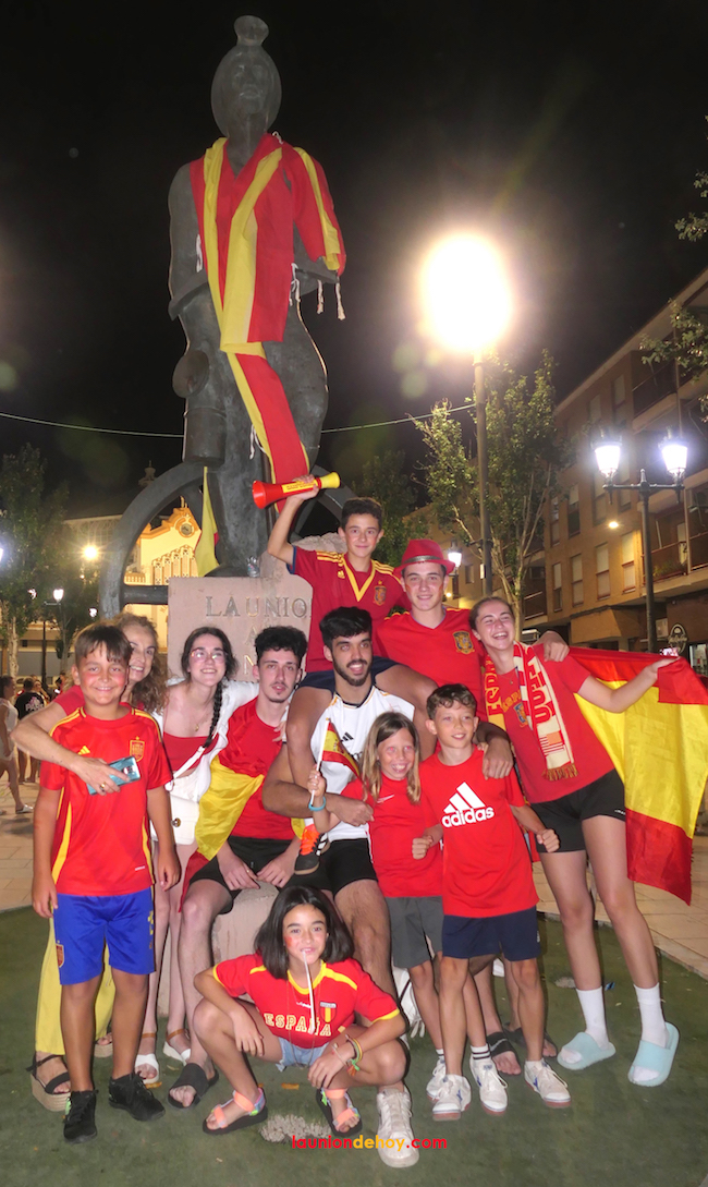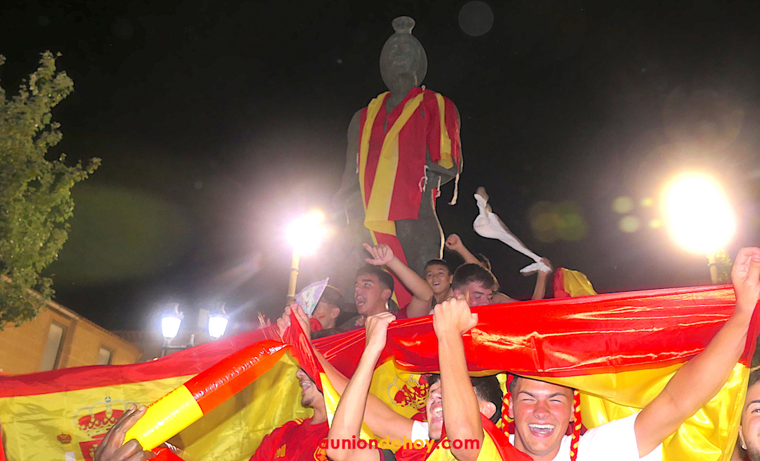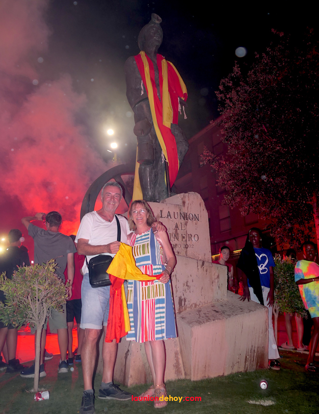El epicentro de la fiesta de la plaza de Joaquín Costa fue el monumento levantado a los trabajadores de la mina en cuanto se le vio con la bandera de España, siendo muchos los que se fotografiaron con una escena nada habitual en una noche tan especial como es la de que nuestra selección ha conquistado la ansiada Eurocopa.
