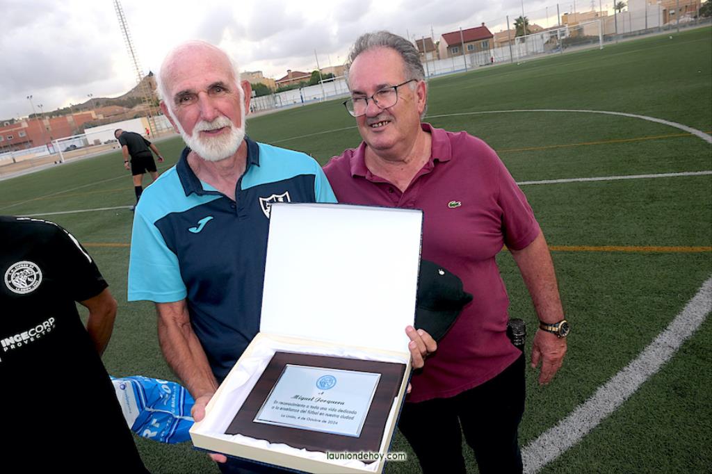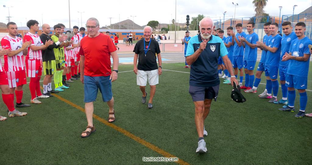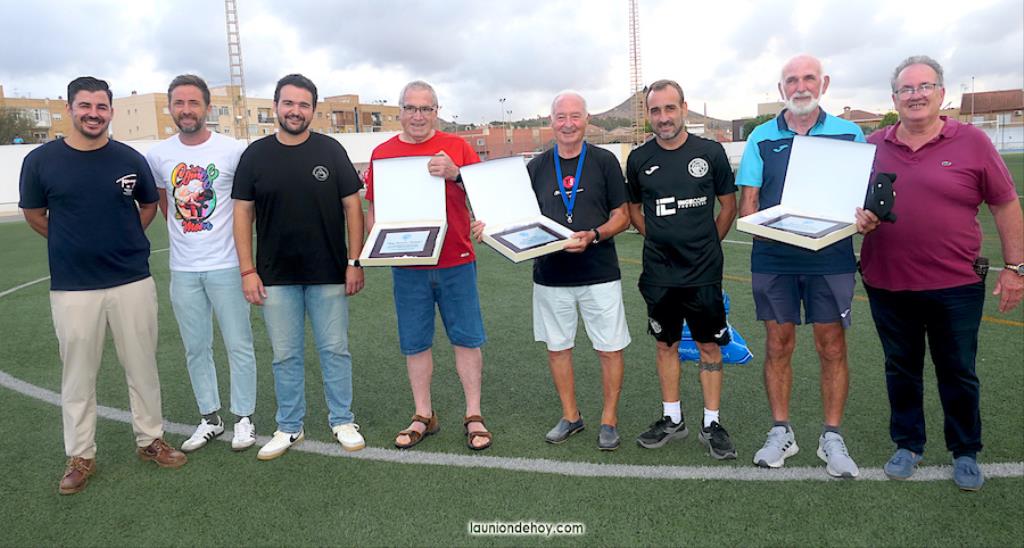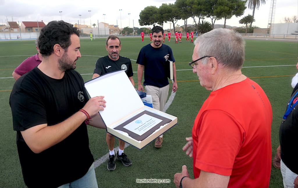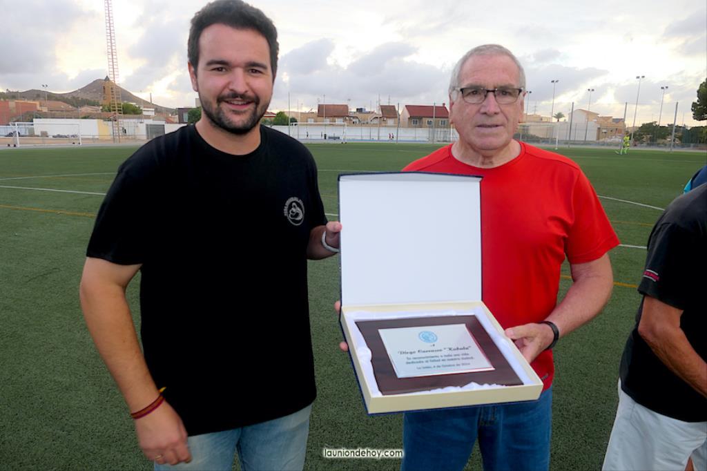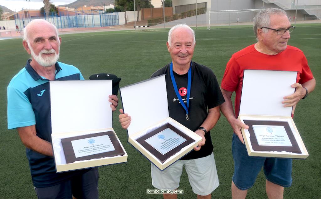 Los homenajeados fueron Diego Carrasco ‘Kubala’ y Miguel Jorquera, a quienes pilló sentados en la grada, y a Juan Pagán Rivas, quien estaba delante del presidente tomándole fotografías. El reconocimiento a los tres es por ser unionense de larga vinculación a balompié minero, unos dentro de clubes y otro, en el caso de Pagán, divulgando lo que han hecho diferentes equipos de La Unión.