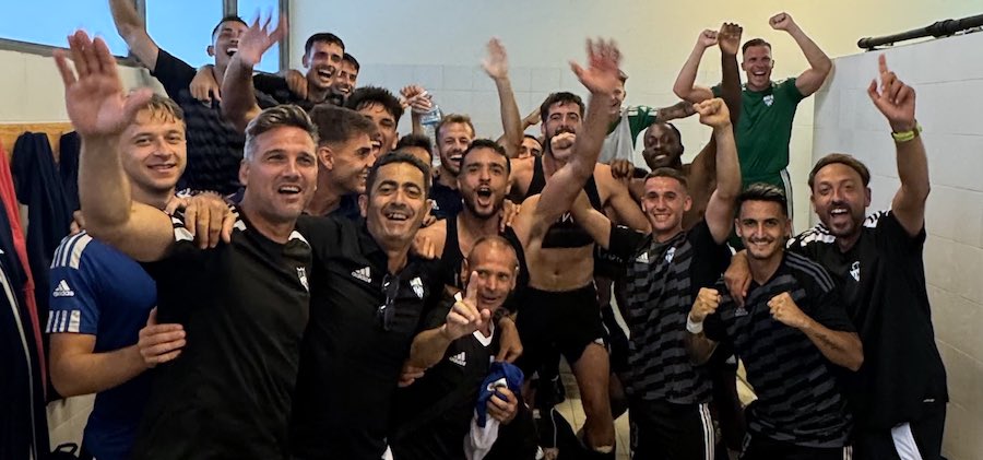 La Unión Atlético zanja su crisis de resultados con victoria ante el filial del Almería con goles de Seth Vega y Rubén Catalá. En la foto, el júbilo en el vestuario tras el triunfo.