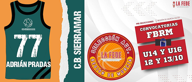 Adrián Pradas, jugador del Club Baloncesto Sierramar, ha sido convocado por la federación territorial para el equipo U14M de la Región de Murcia que disputará el Campeonato de España de selecciones autonómicas que se celebrará en la localidad andaluza de Huelva.