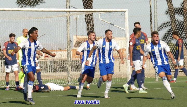 La Unión Atlético derrota al líder, UCAM Murcia, equipo que no perdía partido alguno desde la primera jornada del uno de septiembre, pero el equipo minero tuvo ocasiones para haber conseguido un triunfo bastante más amplio. En la foto, el autor del gol, Espínola, y el que puso el centro, Alvarito, en primer plano en la celebración