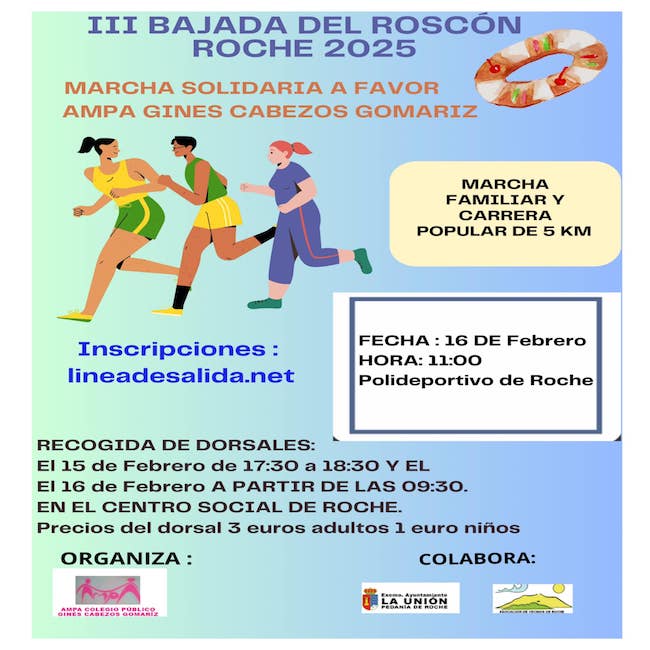 Tras celebrarse las dos primeras ediciones en enero, la tercera cita de la marcha familiar y carrera popular, sobre una distancia de 5 kilómetros, tendrá lugar el domingo 16 del próximo mes, con salida y meta en el polideportivo rochero. Los precios de los dorsales son de 3 euros para adultos y uno para niños. Organiza el AMPA del colegio Ginés Cabezos Gomariz. En la imagen adjunta, los podios de las prueba absoluta del pasado año.