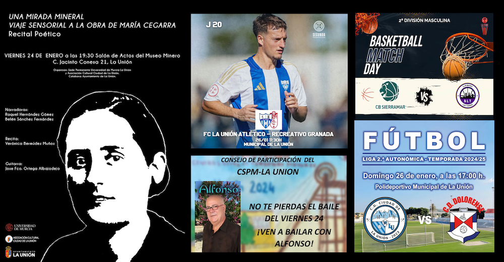 La agenda se activa esta misma tarde con un recital poético dedicado a María Cegarra en el Museo Minero, un partido de fútbol sala en el pabellón Ramón Solano y un baile en el centro de mayores. El domingo, por su parte, doble cita en el campo Miguel Expósito con La Unión Atlético por la mañana y el Ciudad por la tarde. Ofrecemos también los horarios de todos los conjuntos que compiten del CB Sierramar, CD Vedruna, AD La Unión y Surmenor, que jugará dos partido en Roche.