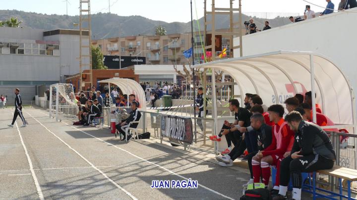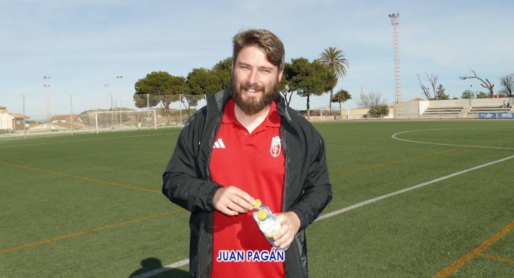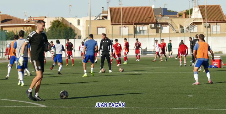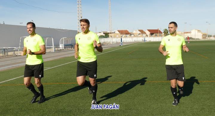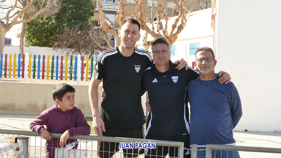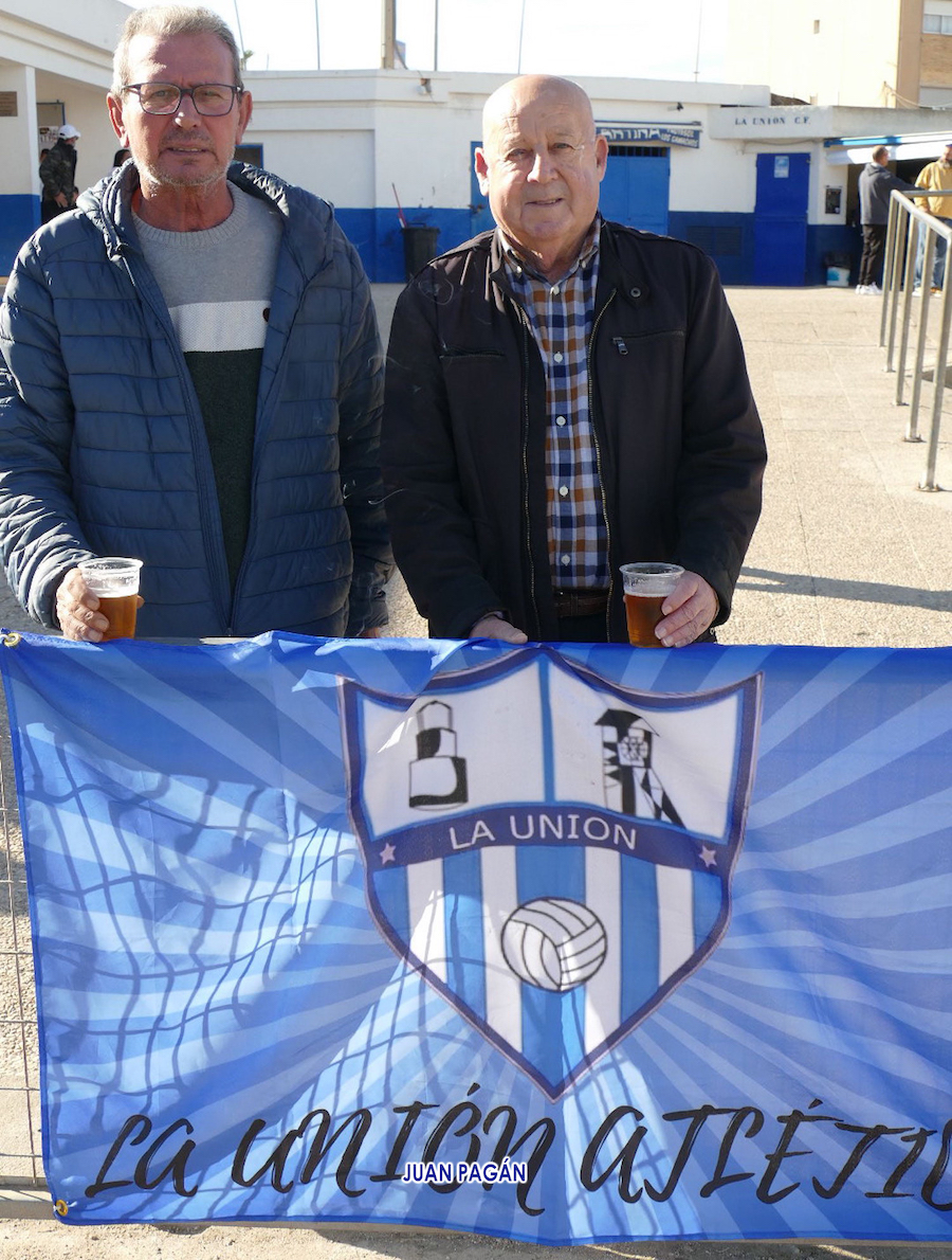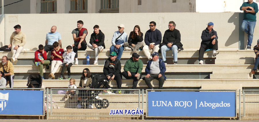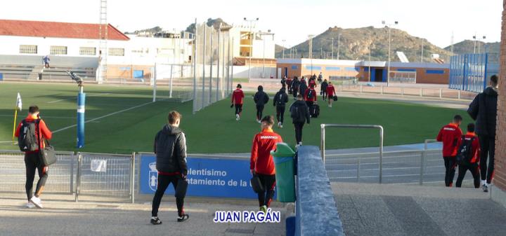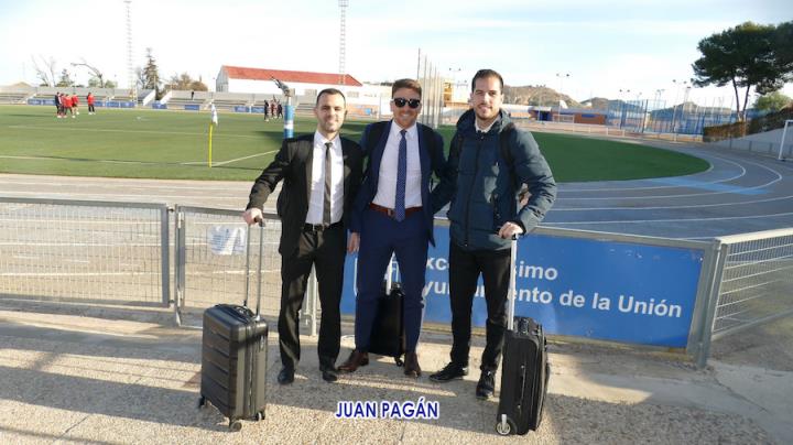 Juan Pagán ofrece un reportaje gráfico de lo acaecido fuera del terreno de juego en la contiende futbolística entre La Unión Atlético y el Recreativo de Granada, incluidos los calentamientos previos de los dos equipos y del trío arbitral, además de espectadores en diferentes puntos del estadio Miguel Expósito.