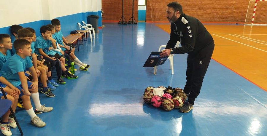Juanmi García Cañavarte ya utiliza con los jugadores de categoría benjamín del CD Vedruna la carpeta de entrenador que, por iniciativa y gestión de Juanjo Carrillo, la obsequiado la-union-ciudad-del-cante-y-minera.es y www.launiondehoy.com para facilitar las enseñanzas e indicaciones a los jugadores de fútbol sala, pues dispone de una pizarra imantada con forma de pista de juego.