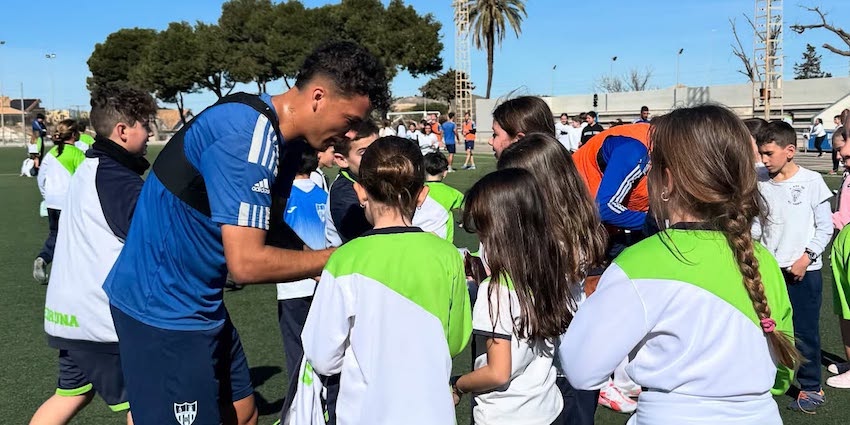 Alumnos del colegio de Nuestra Señora del Carmen pasaron una muy agradable mañana de risas, autógrafos y fútbol en el campo de fútbol Miguel Expósito con la plantilla del equipo minero que encabeza el grupo cuarto de la Segunda RFEF.