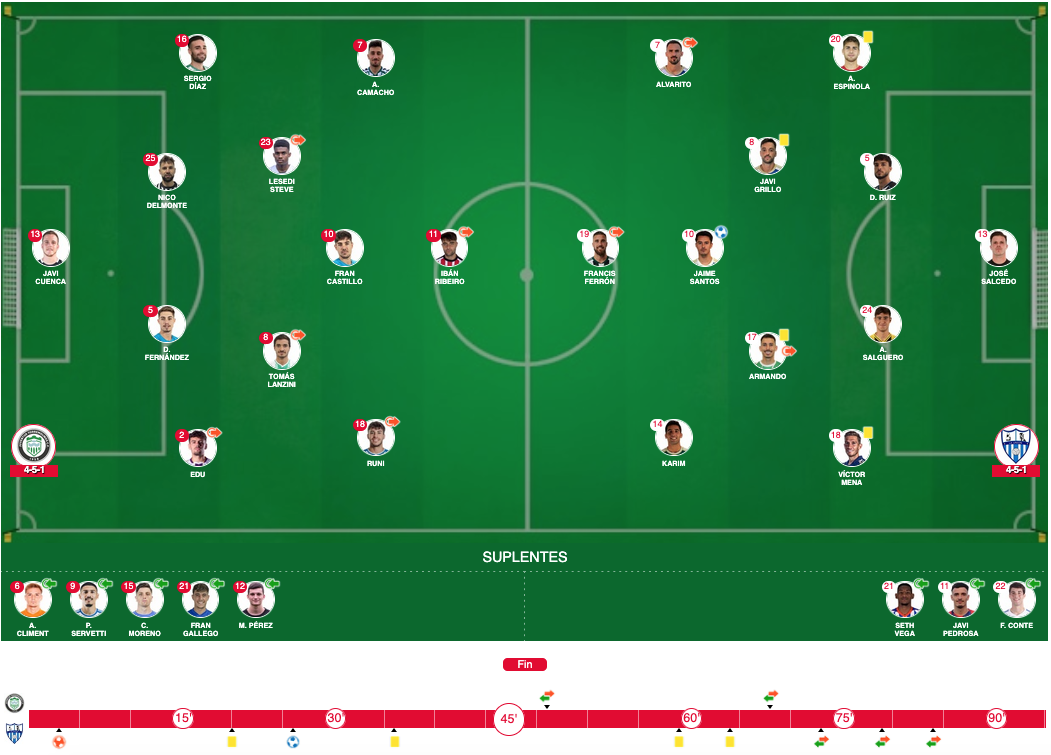GOLES. 0-1. Minuto 2: Sergio Díaz en propia meta. 0-2. Minuto 26: Jaime Santos.