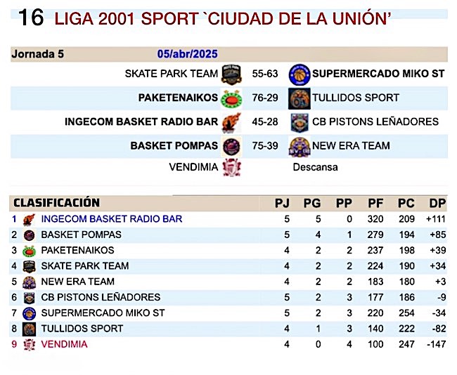 Ingecom Basket sigue firme como líder invicto del campeonato y sólo Básket Pompas parece aguantar su ritmo, cogiendo ya ambos ventaja sobre el tercer clasificado. El resultado más inesperado fue la victoria de Supermercado Miko sobre Skate Park Team.