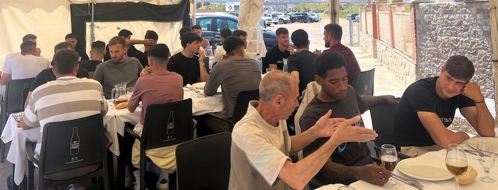 El entrenador de La Unión Atlético, en entrevista en Onda Regional, también destaca que vino de la mano de Quinín y que juntos efectuaron los fichajes. "No sólo con dinero se hace una gran plantilla y este vestuario tiene ambición y ganas". En la foto, jugadores, técnicos y demás personal del club en una comida de hermandad de esta semana.