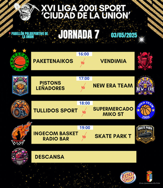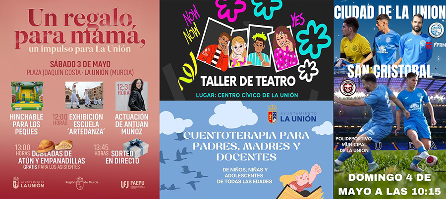 El fútbol toma protagonismo, pues tanto La Unión Atlético como Ciudad de La Unión afrontan partidos decisivos para ascender en sus respectivas categorías. También hay dos partidos del CB Sierramar, jornada de la liga local de baloncesto y tres de fútbol sala, pues el CD Vedruna ya adelantado dos partidos que terminaron con distinto signo. Fuera del deporte, taller de teatro, cuentoterapia y una fiesta previa al 'Día de la madre' en la plaza de Joaquín Costa.