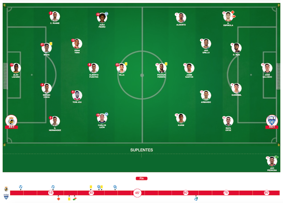 GOLES 1-0. Minuto 4: Carlos León. 2-0. Minuto 16: Joao Pedro. 2-1. Minuto 65: Jaime Santos marca de penalti.
