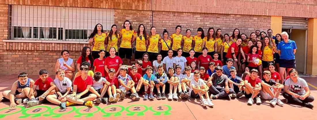 La líbero unionense del Unicaja Andalucía de Sevilla de la máxima categoría del voleibol nacional, ha estado hoy con sus compañeras de la selección española en el colegio Herrerías, donde ha compartido un tiempo muy agradable con los alumnos de sexto de primaria y los docentes. El equipo está concentrado en el CAR de Los Narejos preparando la 'European Golden League', en al que debutarán este viernes en Montenegro. En la foto se observa a la unionense de amarillo junto al balón