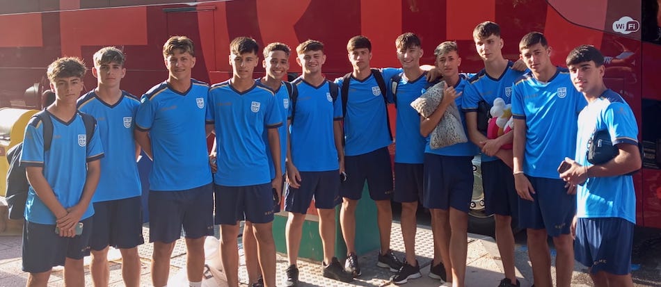 El delantero del FC Cartagena SAD y sus compañeros debutarán este 3 de julio, enfrentándose a Baleares a las 12.45 horas y a la Comunidad Valenciana a las 18.45 horas. En la foto superior, Jorge Botella González con sus compañeros momentos antes de salir hacia tierras gaditanas. Abajo, los 12 convocados.