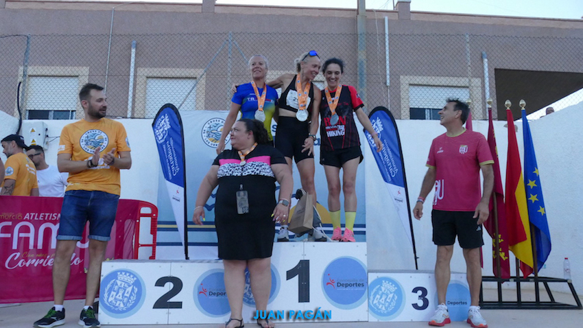 La unionense sigue abonada a estar en el 'cajón' de las carreras populares desde que ha regresado a la competición, siendo en esta ocasión vencedora de la categoría veteranas B de la segunda edición del cross de Los Urrutias. En la foto se la observa con las medallas junto a su marido, Juanma Silvente, también deportista, en su caso en bicicleta de montaña.