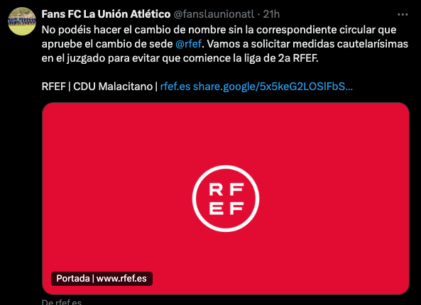El portal 'Fans FC La Unión Atlético' ha publicado en el que afirma que la Real Federación Española no ha llevado a cabo la circular que apruebe el cambio de sede del club a Málaga y que van a pedir en el juzgado medidas cautelares, evitando que comience la liga en Segunda RFEF.