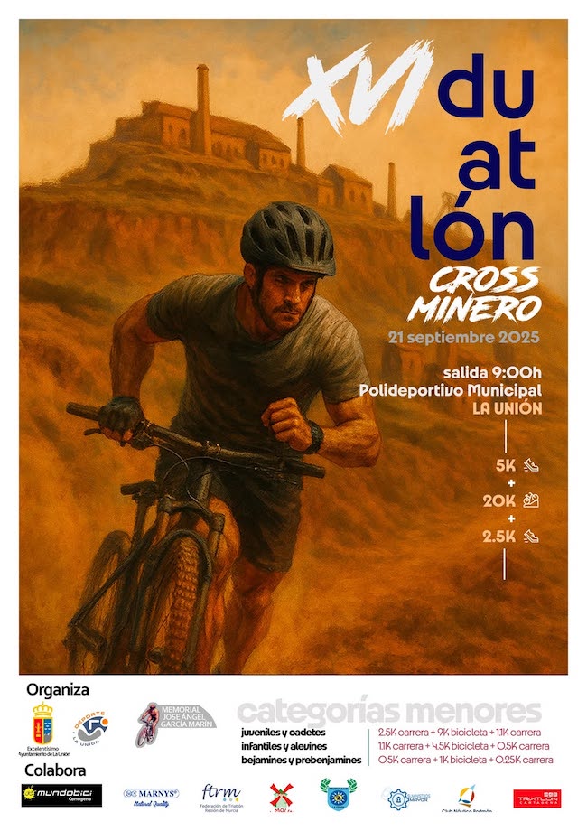 El 'Duatlón Cross Minero' se celebró el 29 de octubre en su edición XIV y el 20 del mismo mes en 2024. La prueba volverá a congregar a categorías absoluta y menores y a ser 'Memorial José Ángel García Marín'. La salida será desde la plaza de Los Sánchez, junto al polideportivo municipal 'Antonio Sánchez', donde también se ubicará la meta. A las nueve horas comenzará la prueba absoluta, mientras que juveniles y cadetes lo harán a las 11.30 horas, infantiles y alevines a las 12.30 y benjamines y prebenjamines a las 13.30. Organiza el Ayuntamiento de La Unión a través de su concejalía de Deportes.
