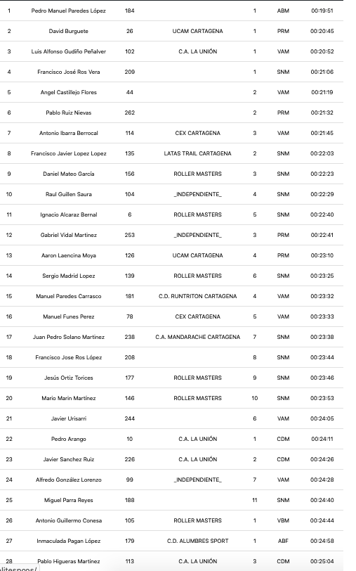 El tercer puesto fue logrado con brillantez por Luis Alfonso Gudiño Peñalver, del Club Atletismo La Unión, a quien sólo le separaron 7 segundos del segundo puesto. Por su parte, Ignacio Alcaraz, de Roller Masters La Unión, fue noveno.
