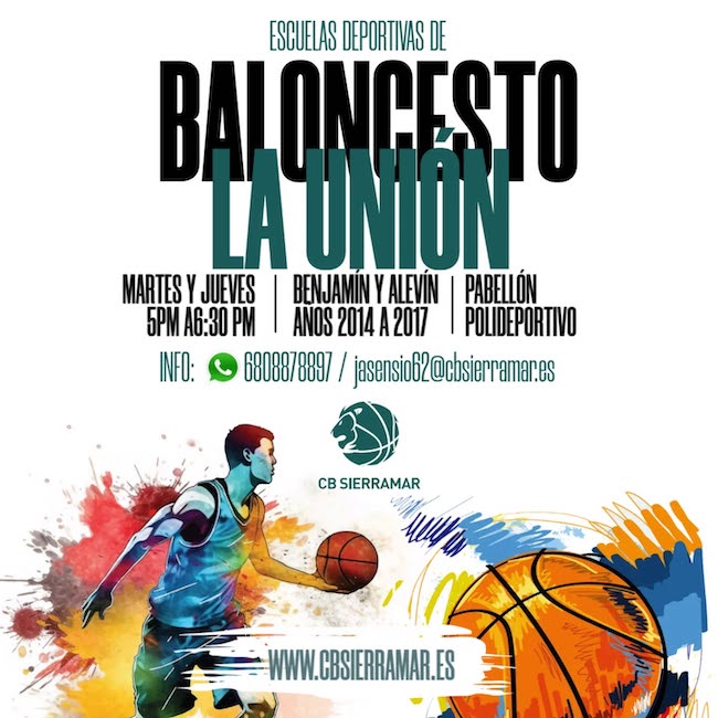 2. Escuela de Baloncesto La Unión. Polideportivo de La Unión. Martes y jueves. Horario: 17 a 18.30 horas. Benjamín y alevín (nacidos en los años 2014 a 2017). Más información y WhatSapp: 6808878897. Informa CB Sierramar