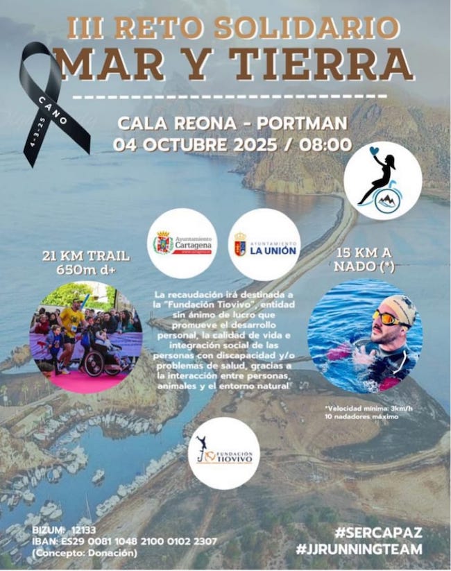 Este sábado 4 de octubre se celebra en Portmán, con la colaboración del complejo industrial de Repsol en Cartagena, la tercera edición del reto solidario ‘Mar y Tierra’; una iniciativa deportiva y benéfica que une esfuerzo, inclusión y compromiso social. El evento, impulsado por Francisco Segura y Joaquín Susmozas, tiene como objetivo recaudar fondos para la Fundación Tiovivo, dedicada a mejorar la calidad de vida de personas con discapacidad a través de la interacción con animales y el entorno natural.