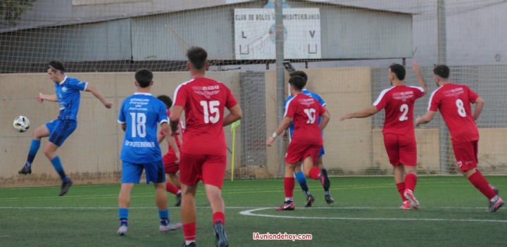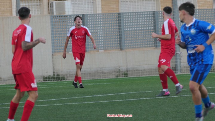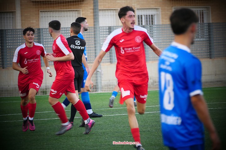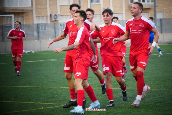CD Ciudad de La Unión se adelantó en el marcador con un gran gol de Aday (foto superior mientras es felicitado por sus compañeros), pero el CD Mediterráneo reaccionó tras empatar de penalti y firma una 'manita' ante un rival que quedó diezmado a los 50 minutos de juego.