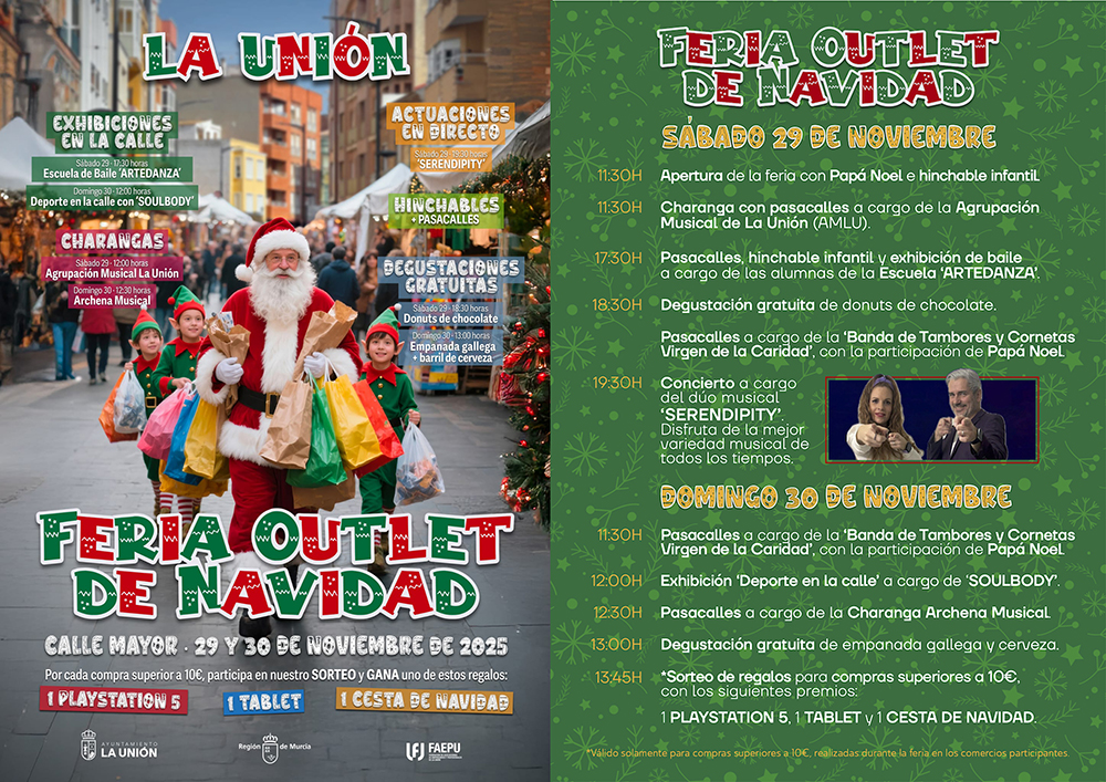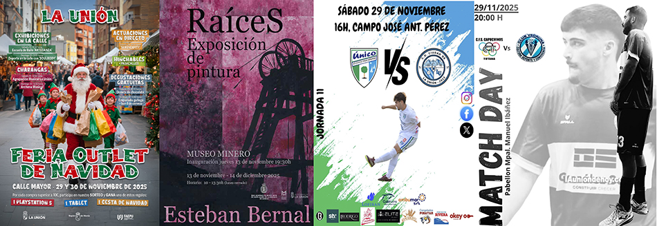 La celebración de la 'Feria Outlet Navidad' en el casco histórico de la ciudad destaca en la agenda del fin de semana de La Unión, que también ofrece las visitas a la exposición 'Raíces' en el Museo Minero. En el deporte, CD Vedruna tratará de mantener el liderato en su visita al Capuchinos en Totana, que sólo ha perdido un partido esta temporada, mientras que el CD Ciudad de La Unión lo tiene a priori complicado en San Pedro del Pinatar frente al tercer clasificado de su grupo. Ofrecemos rivales, fechas y horarios de los partidos de categorías de base de fútbol sala, baloncesto y voleibol.