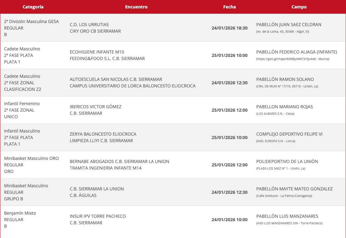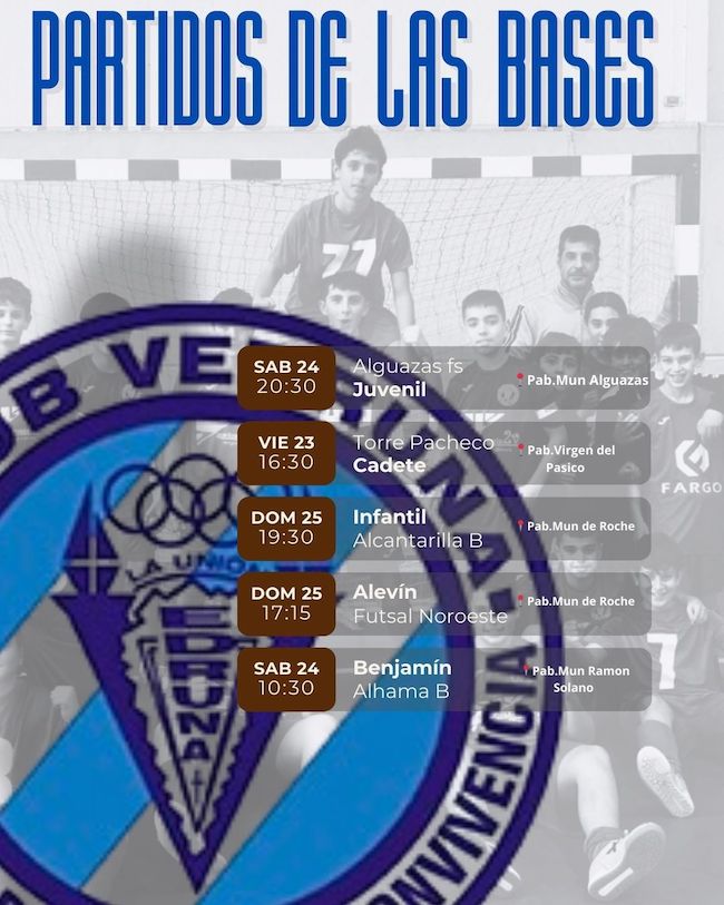 El deporte es el aliciente principal de estos días, aunque descansa el primer equipo del CD Vedruna de fútbol sala y viajan el CD Ciudad de La Unión de fútbol y el CB Sierramar de baloncesto, afrontando este último el duelo vecinal contra el CD Los Urrutias en El Algar. También ofrecemos rivales, fechas y horarios de los partidos de los equipos de base, siendo Roche el que acoge dos encuentros de fútbol sala y la ciudad minera la que será marco de dos del deporte de la canasta.