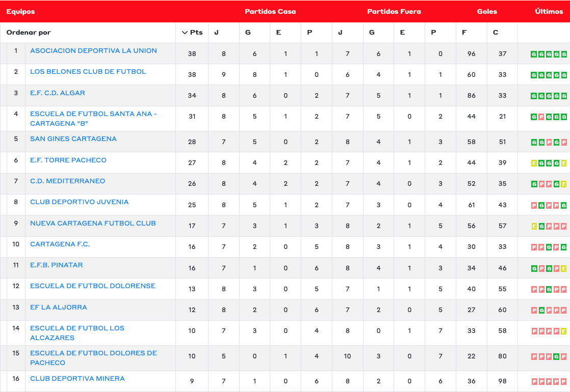 La AD La Unión acaba en el primer puesto de la tabla la primera vuelta del campeonato al tener mejor 'gol average' que Los Belones (diferencia de 49 goles a favor por 27), lo que aviva la ilusión de acabar la temporada en esta posición que da acceso directo a la liga autonómica, división que se perdió la pasada campaña. El tercer puesto es para el CD Algar, que está a cuatro puntos de ambos. Destacar también que el cuadro minero está muy cerca de llegar a la centena de goles marcados.