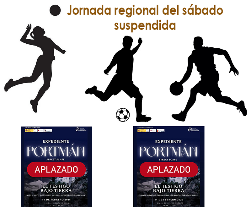 Las federaciones territoriales de fútbol, fútbol sala, baloncesto y voleibol han emitido comunicados informando de la anulación de los partidos para hoy, 14 de febrero, debido el aviso de nivel naranja por fuertes vientos y la previsión climática adversa. Por su parte, Servicios Sociales de La Unión también comunica que se cancelan las actividades de 'Street Scape' ('paisaje callejero' es su traducción) que se iban a celebrar esta mañana en Portmán y esta tarde en Roche.