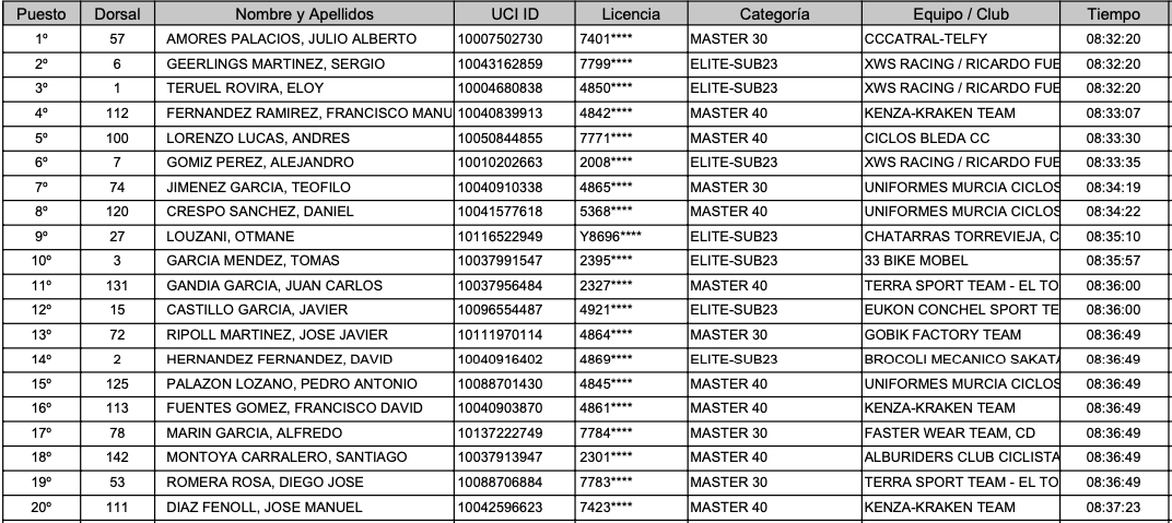 En la etapa de ayer de esta vuelta ciclista regional de carácter aficionado compitieron 135 corredores. En la general, Julio Alberto Amores es primero con un tiempo de 8 horas, 32 minutos y 20 segundos, el mismo tiempo que levan Sergio Geerlings y Eloy Teruel, entrando los tres en el grupo perseguidor del vencedor de la jornada. Este domingo es la contrarreloj de Portmán, sexta de las ocho etapas del campeonato y que se perfila como decisiva.