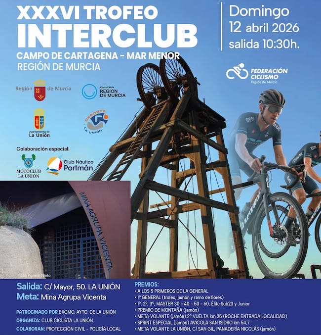El trofeo interclub, considerado como la vuelta ciclista regional de carácter amateur en la Región de Murcia, llega a su final. Comenzó el 17 de enero con final de etapa en San Javier y después ha afrontado seis etapas (Santomera, Torre Pacheco, Portmán, Lorca y doble en La Palma), siendo su epílogo este domingo con la jornada que parte desde la calle Mayor de La Unión (la salida se dará a las 10.30 horas) y culmina en la mina Agrupa Vicenta, tras el paso por diversas poblaciones del entorno, como Los Camachos, El Algar, Los Belones y Portmán, desde donde se tomará hacia el cruce de La Esperanza, y de ahí hacia la calle Mayor y la mina.