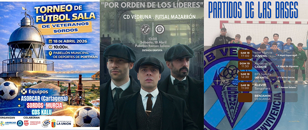 El CD Vedruna cierra la liga enfrentándose al segundo clasificado en un partido que será ensayo para la fase de ascenso, mientras que el juvenil entra en la recta final de la lucha por alcanzar las eliminatorias finales. En fútbol, el Ciudad tratará de sellar la permanencia pese a que enfrente está un aspirante al ascenso, mientras que en juveniles la AD La Unión precisa tener éxito en Cartagena para mantener la esperanza de evitar el descenso. En baloncesto, vuelve a competir tras la Semana Santa el equipo de segunda división del CB Sierramar y hay nueva jornada de la liga local. Un fútbol sala especial y singular se jugará en Portmán con el torneo para sordos veteranos y el domingo hay marcha cicloturista en la ciudad. Antes, el sábado, espectáculo infantil musical en el Museo Minero.