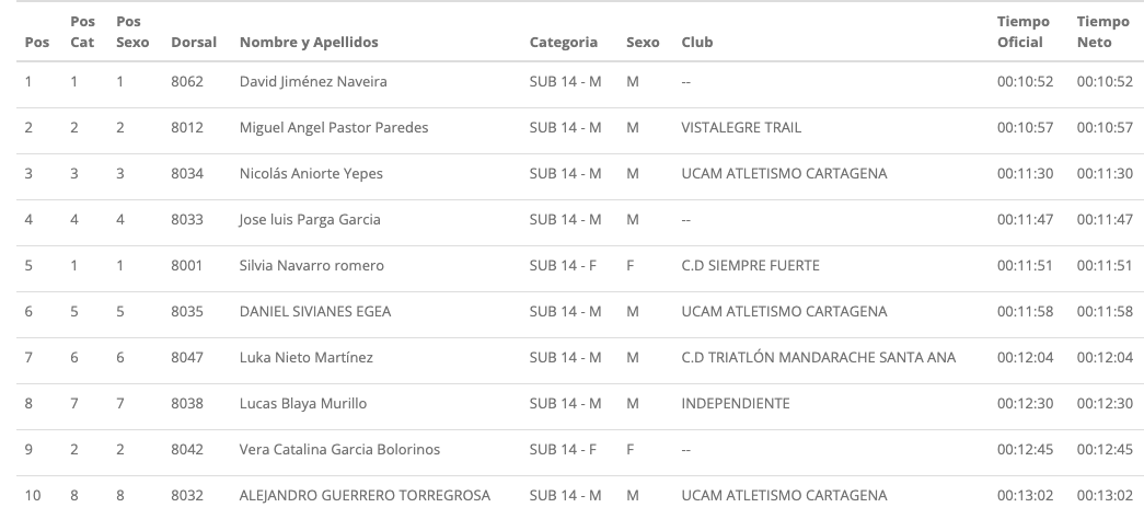 Por su parte, David Jiménez Naveira, del Club Atletismo La Unión, fue el más rápido en la carrera de 3,1 kilómetros de la categoría sub-14, sacando 5 segundos de ventaja sobre Pastor Paredes en la línea de meta. Participaron 70 corredores que no superaban los 14 años de edad.
