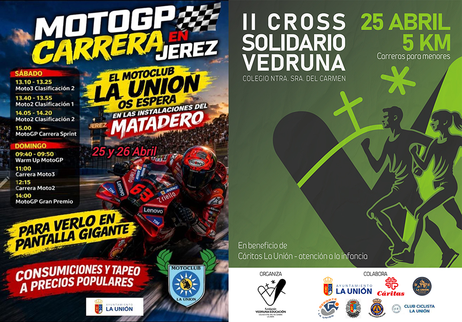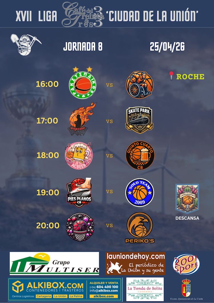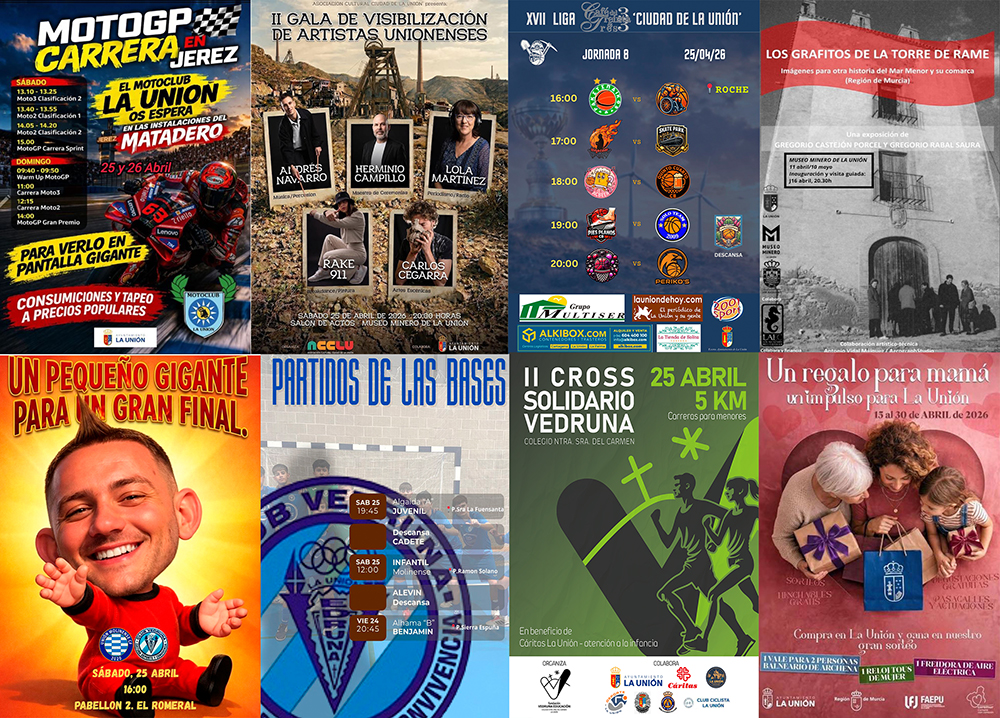 La amenaza de lluvia para este sábado provoca que la ‘Liga local de baloncesto’ no se juegue en ‘La Bombonera’ y se traslade a Roche. En el deporte de la canasta hay 6 partidos del CB Sierramar, mientras que en fútbol sala hay 4, entre los que figura el de final de liga para el invicto CD Vedruna sénior. En fútbol, difícil salida del Ciudad al campo del tercer equipo del Real Murcia y encuentro muy importante para el juvenil de la AD La Unión en casa. El sábado se disputará el cross Vedruna en su segunda edición, la misma que esa noche vivirá la gala de visibilización de artistas unionenses. Es novedad la pantalla gigante que monta Moto Club La Unión para ver las carreras de Jerez.