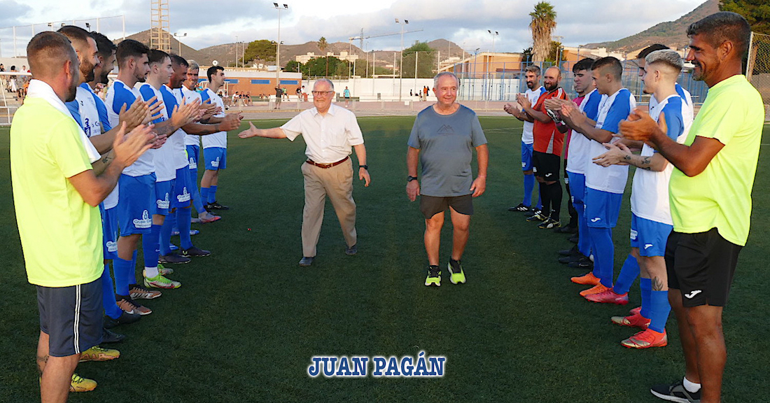 Ginés Cabezos Gomariz y Francisco Vera, a quienes se observa avanzar por el terreno de juego por un pasillo formado por futbolistas, recibieron del club Ciudad de La Unión sendas placas como reconocimiento a todos los años "de trabajo de manera desinteresada hacia el deporte de La Unión".