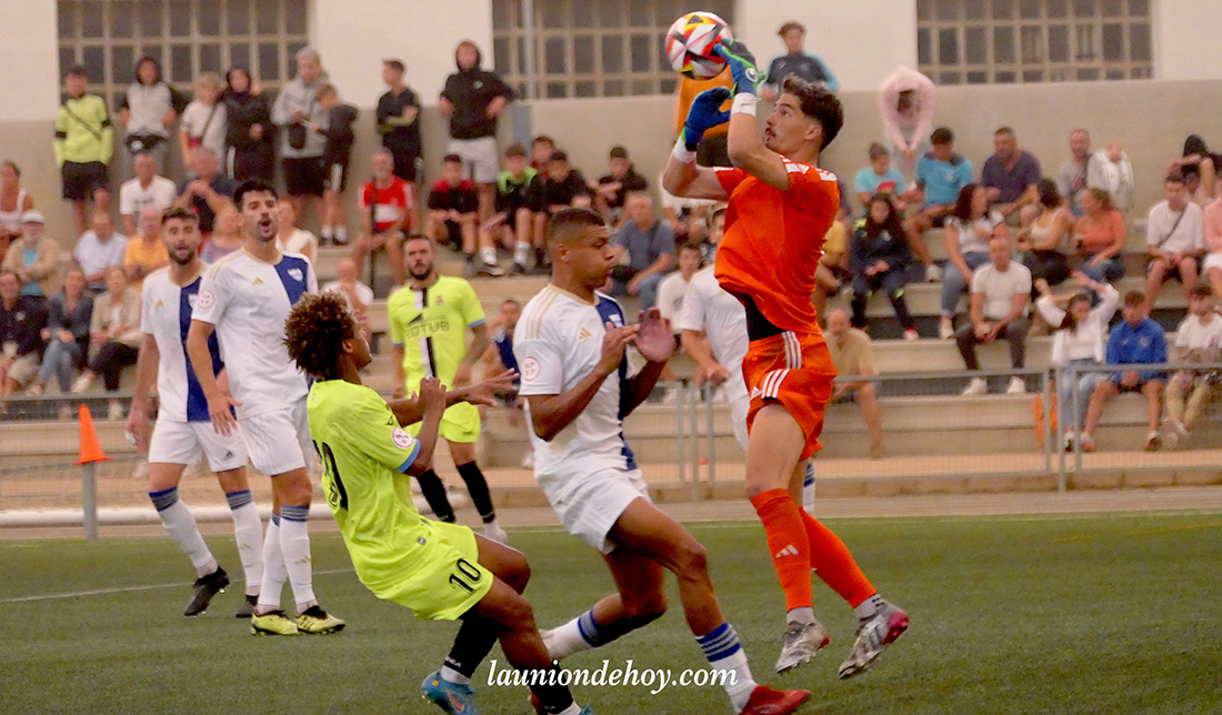 La Unión Atlético pierde en su estreno en Segunda RFEF (con nueva indumentaria) ante la Balona en un partido marcador por el fuerte viento lateral, que obligó a los jugadores a efectuar un esfuerzo extra que no aportó brillantez a un partido que resolvió un buen remate de Joao Pedro. En la foto, el meta local Chenu ataja un balón ante la presencia de su compañero Ferrer y del autor del único tanto del partido.