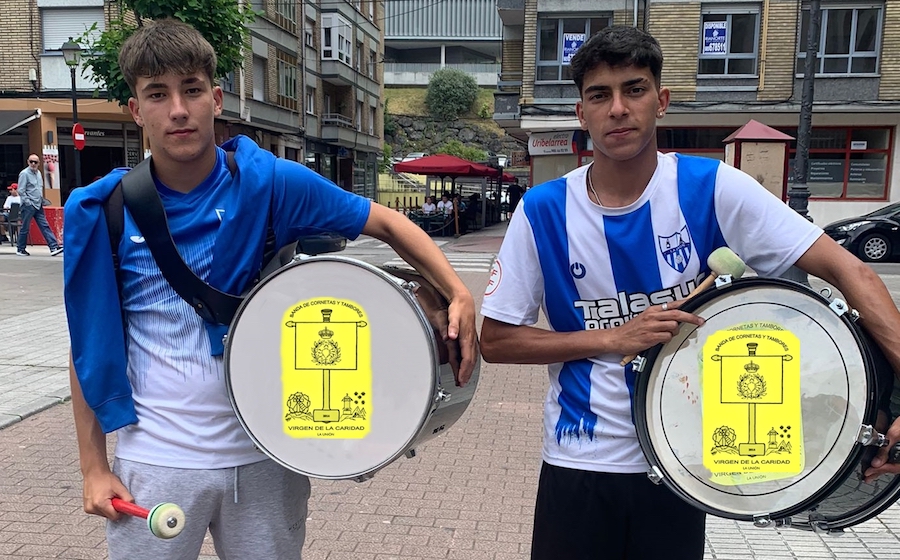 Los jóvenes Sami Ghani y Carlos Madrid son integrantes de la banda de corneta y tambores Virgen de la Caridad y militan en el equipo juvenil de la AD La Unión. Este pasado domingo estuvieron en tierras asturianas para animar con timbales y bombos a La Unión Atlético en el partido frente a L'Entregu, festejando el final feliz con el salto de categoría. También entonaron por diversos puntos del pueblo de El Entrego el cántico '¡Yo soy de La Unión, de La Unión, de La Unión...!".