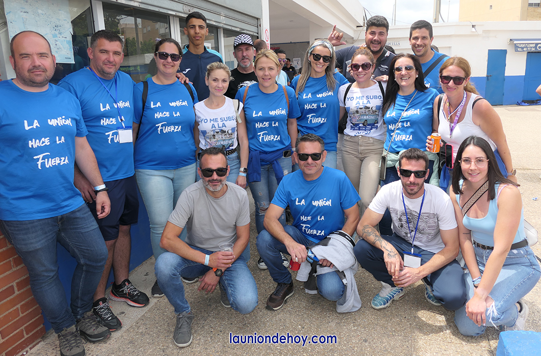 La fiesta previa al encuentro organizada por La Unión Atlético ha potenciado el gran ambiente que envolverá un partido histórico y que será transmitido por la televisión autonómica 7TV RM, siendo la primera vez que se ofrece un partido en directo del equipo unionense en su estadio. En la foto superior, un grupo de aficionados locales con un mensaje muy significativo en sus camisetas de cara al partido de esta tarde en cuanto a la fusión entre jugadores y aficionados.