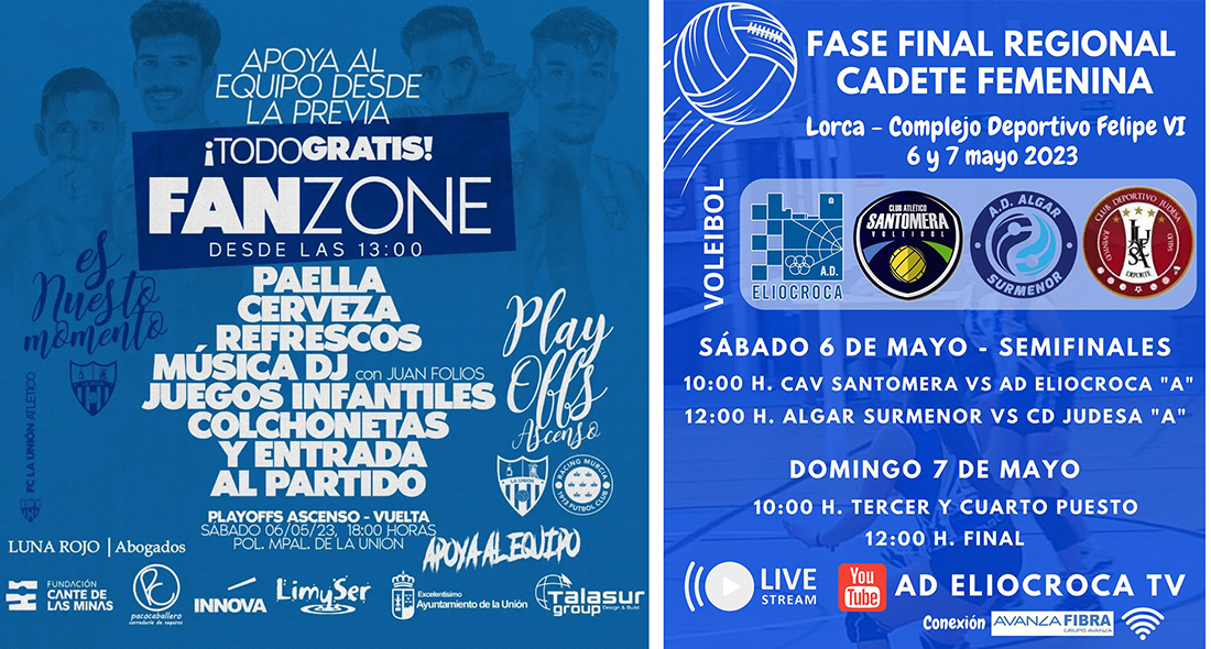 La Unión Atlético se juega este sábado seguir en la lucha por el ascenso y para ese fin busca el apoyo de su afición, habiendo organizado una fiesta previa con entrada gratuita desde las 13 horas, con numerosos atractivos. Para Portmán Atlétic acaba la liga y también hay partidos en competiciones federadas para el fútbol sala del CD Vedruna (partido clave para la formación cadete) y el baloncesto del CB Sierramar. En la liga local del deporte de la canasta la jornada final de liga pasa a La Unión. Por su parte, el voleibol femenino cadete busca el título regional. Fuera del deporte destaca el 'Día de los museos' en Roche.