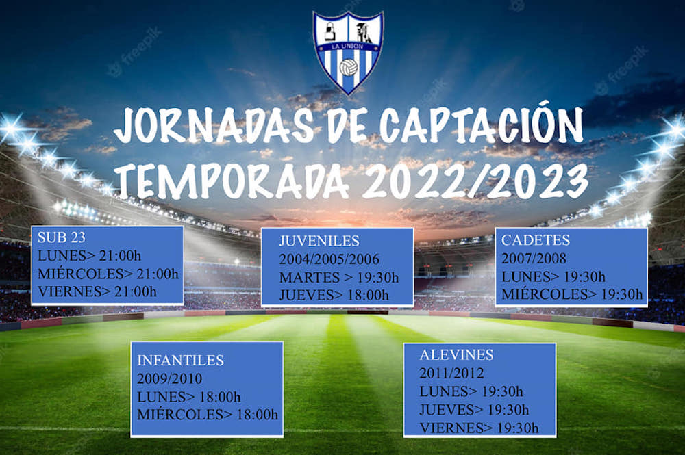 La escuela de fútbol de la AD La Unión inicia las pruebas este lunes para las categorías sub-23 (nacidos en 2000 a 2003), juvenil (2004-2006), cadetes (2007-2008), infantiles (2009-2010), alevines (2011-2012), benjamines (2013-2014), prebenjamines (2015-2016), chupetas/biberones (2017/2018) y féminas (2004/2010).