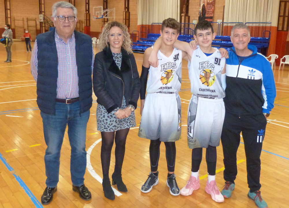 Héctor Baños Rama y Sergio Egea Manrubia son dos jugadores unionenses que juegan en el equipo de baloncesto del FC Cartagena-EB Salesianos. En la imagen posan con Antonio, Eva y Juanjo.