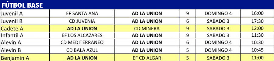 Tres equipos de fútbol base de la AD La Unión, el alevín de fútbol sala del CD Vedruna y Bernabé Abogados CB Sierramar en baloncesto tienen partidos hoy. Anoche, el equipo de división de honor cadete saldó con derrota por 1-9 su partido adelantado ante CD Puerto FS.