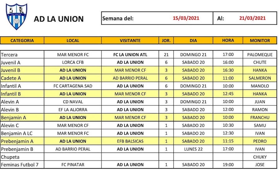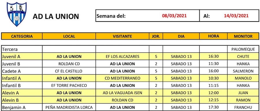Descansa el equipo de La Unión Atlético de Tercera División, pero sí tienen compromisos ocho conjuntos de fútbol base. También tienen compromisos ligueros Club Baloncesto Sierramar y CD Vedruna de fútbol sala.