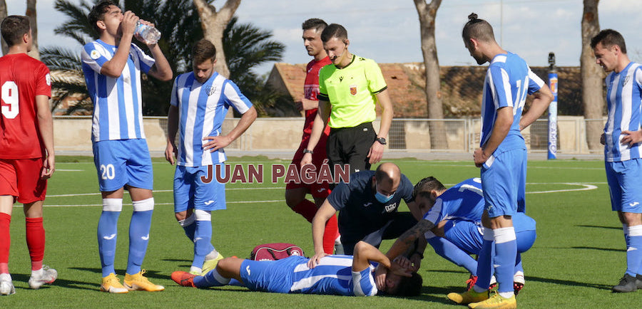 El equipo blanquiazul recupera este 10 de febrero el partido frente al Muleño pendiente de la jornada 12 de Tercera División en el que necesita sumar los tres puntos para seguir con opciones firmes de ascenso. En la foto Sergio Jiménez, quien al igual que Diosbert, cayó lesionado el pasado domingo frente a la Minera.