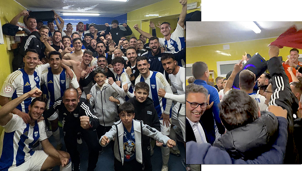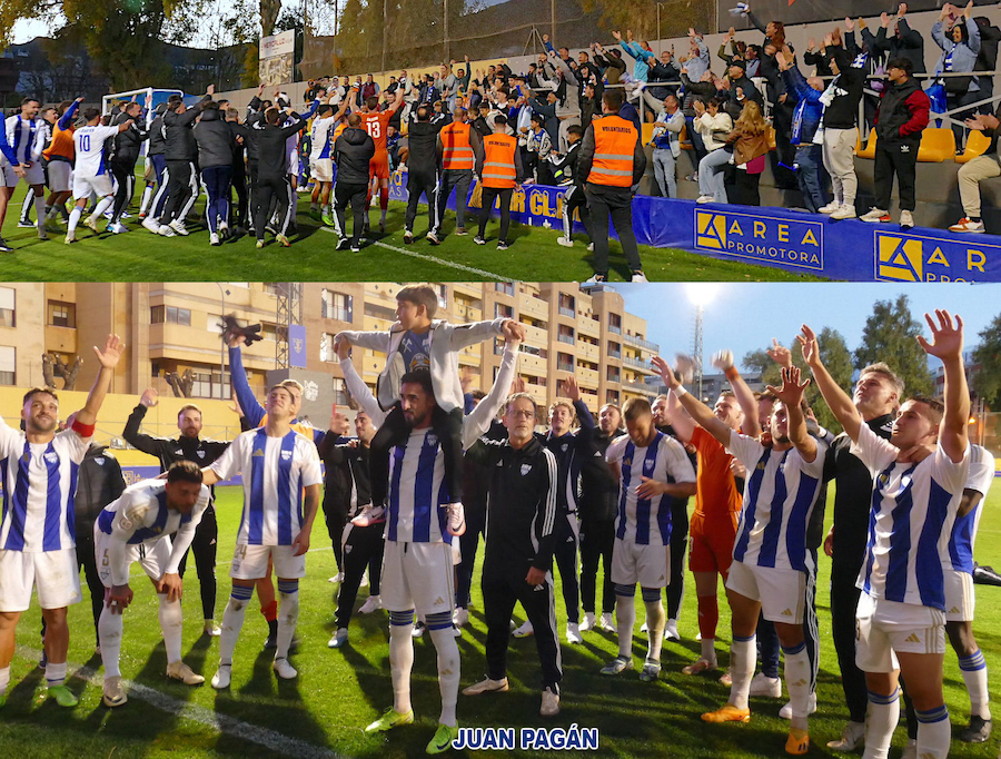 José Miguel Campos, su entrenador, expone los elementos que han confluido para que un equipo que estaba fuera de las quinielas de los aspirantes al ascenso tenga tan cerca conseguirlo como campeón. Además, expresa que se va a preparar "bien" el partido del próximo domingo para no demorar más el salto de categoría, aunque no será fácil, pues el Águilas llega con la urgencia de que sus opciones de jugar la fase de ascenso pasan por ganar en tierra minera. Las fotos muestran la fiesta en el vestuario tras la victoria de ayer en Orihuela
