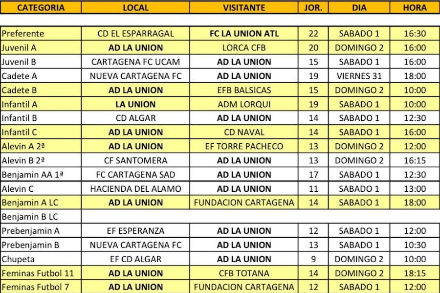 La Unión Atlético de Preferente visita al CD Esparragal este sábado. En categorías de base, diecisiete equipos de la AD La Unión tienen compromisos este fin de semana.