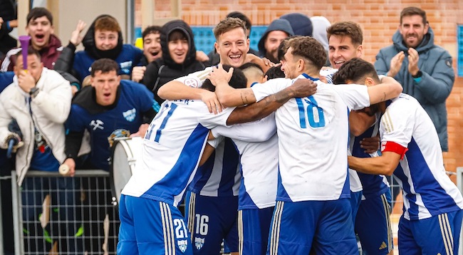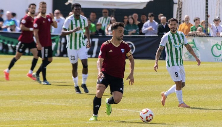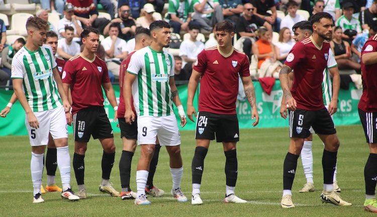 El equipo que entrena Campos conseguirá el ascenso directo a Primera RFEF si, caso de que Juventud Torremolinos gane en las cuatro jornadas que quedan para el final, suma 10 puntos ante dos equipos que lucha por no bajar (Cádiz Mirandilla y Linense) y dos que tratan de alcanzar las plazas de la fase de ascenso (Orihuela y Águilas). Foto del pasado domingo de jugadores de los dos equipos que encabezan el grupo