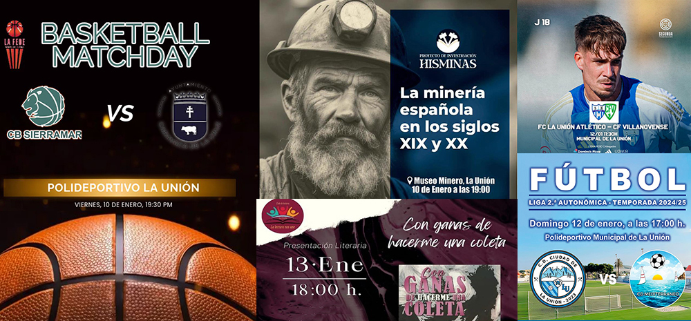 Vuelven las competiciones deportivas de fútbol, fútbol sala, baloncesto y voleibol. La Unión Atlético buscará el domingo regresar al camino de las victorias por la mañana en el mismo escenario en el que por la tarde el Ciudad de La Unión luchará por el liderato. También ofrecemos rivales, horarios y fechas de los partidos de la AD la Unión, AD Algar Surmenor y CD Vedruna. Este último jugará partidos en la ciudad y en Roche. Fuera del deporte, hoy hay una jornada de historia minera en el museo y el día 12 se presenta un libro en Carmelitas.