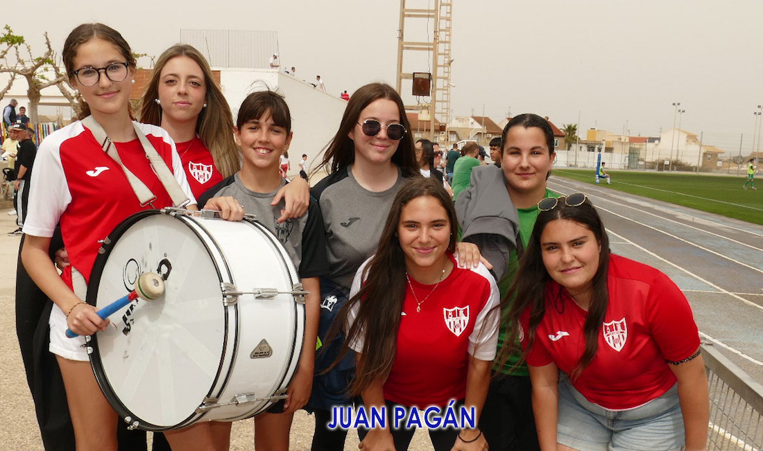 Un grupo de chicas que juegan en los equipos femeninos de la AD La Unión se han convertido en asiduas a los partidos del polideportivo para animar a La Unión Atlético con tambor incluido, que va rotando de manos.